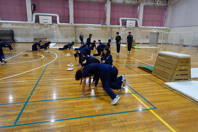 授業内容は器械運動の「跳び箱運動」です。自分たちで技を選択し、決められた時数の中で計画を立てて、場合によっては自分で動画を撮影し検証したり、黒田先生にアドバイスを求めたりして、自ら思考判断を深めて技を完成させていくというものです。自分の運動能力と相談したりして、みな一生懸命技を磨くことをしていました。周囲の友人と話し合い、工夫を加える場面もあったりして、協働して学ぶ場面もたくさん見られました。