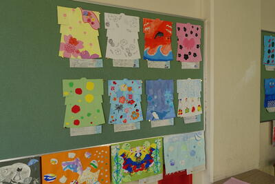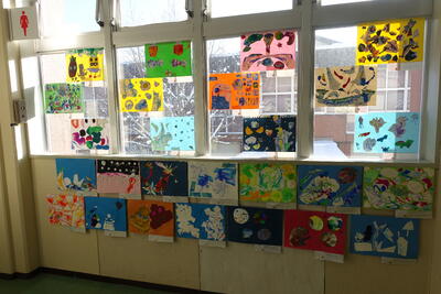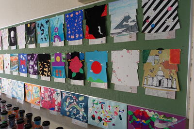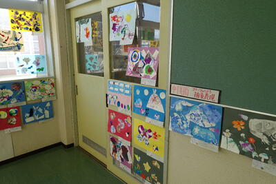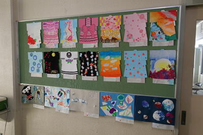 今週、2階美術室前に全学年の作品が一新されて展示されました。その様子をブログで紹介したいと思います。