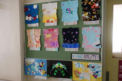 2年生は「着物のデザイン」ということで、着物型の台紙に様々な色で絵付けをして作品を完成させています。こんな着物の柄があったら着てみたいな、と思うデザインや、かなり斬新なものまで、個性豊かな作品が並んでいました。
