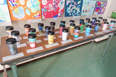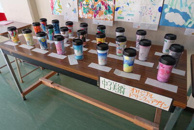 3年生は「オリジナルドリンクのデザイン」です。タンブラーのデザインをするというもので、世界に一つだけのタンブラーがテーブルに並んでいました。自分で作ったものを誰かにプレゼントするのも良いでしょうし、もちろん、自分で使うのもありですね。