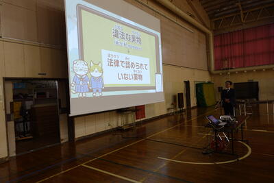 厚生労働省が啓発資料を出しており、そのスライドを中心に身近に迫る薬物の恐怖を、アニメーション動画等を利用しながら分かりやすく説明していただきました。