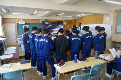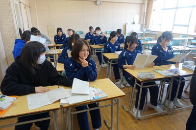 この授業が卒業合唱練習の始めということで、radwimpsの『正解』の楽譜をもらい、音取りをしていました。最初に女子、次に男子がピアノを取り囲み、濱田先生の指導のもと、意欲的に取り組んでいました。
